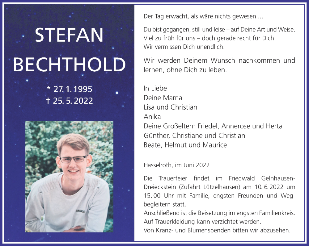 Hier finden Sie alle Traueranzeigen aus der Zeitung, die bisher für Stefan Bechthold erschienen sind. Weitere Traueranzeigen, die in der Zeitung erscheinen, werden hier ebenfalls aufgelistet