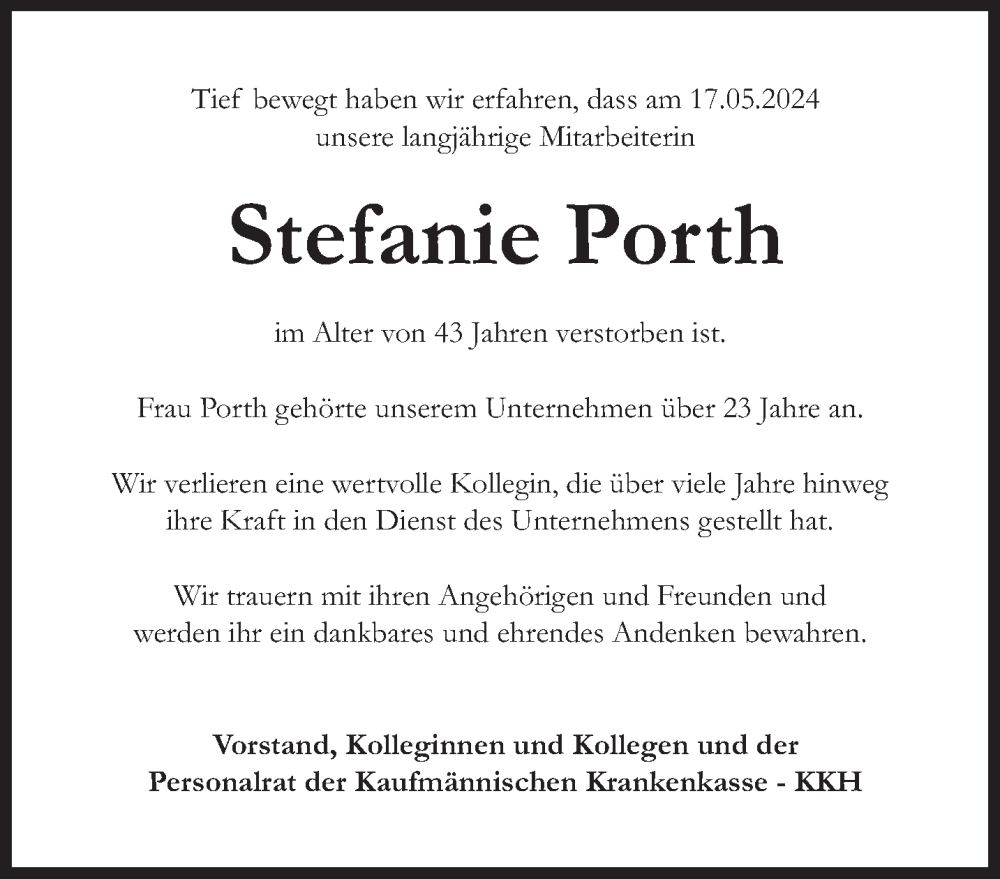 Hier finden Sie alle Traueranzeigen aus der Zeitung, die bisher für Stefanie Porth erschienen sind. Weitere Traueranzeigen, die in der Zeitung erscheinen, werden hier ebenfalls aufgelistet
