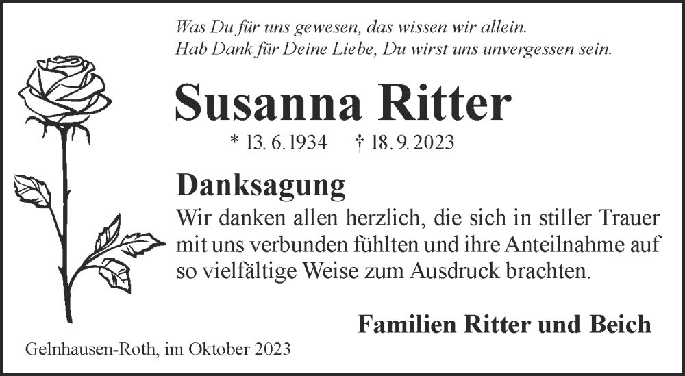 Hier finden Sie alle Traueranzeigen aus der Zeitung, die bisher für Susanna Ritter erschienen sind. Weitere Traueranzeigen, die in der Zeitung erscheinen, werden hier ebenfalls aufgelistet