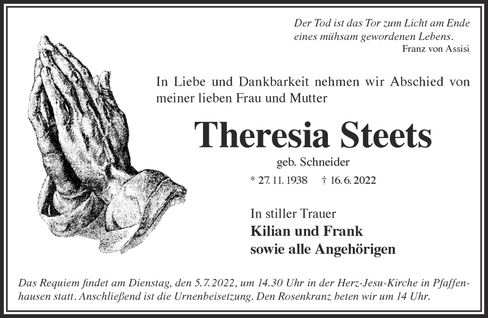 Hier finden Sie alle Traueranzeigen aus der Zeitung, die bisher für Theresia Steets erschienen sind. Weitere Traueranzeigen, die in der Zeitung erscheinen, werden hier ebenfalls aufgelistet