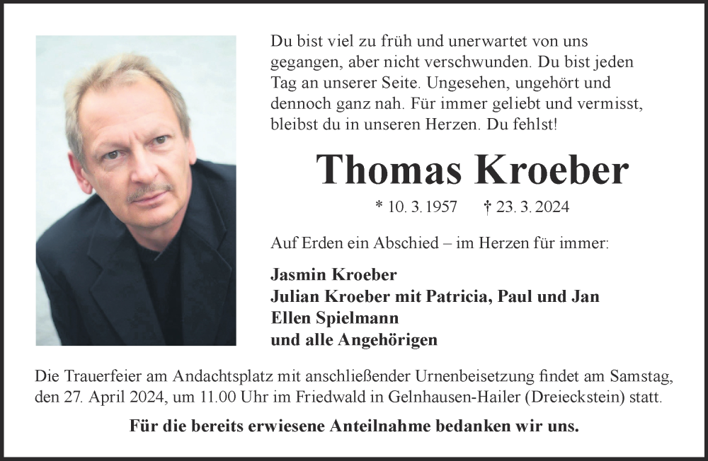 Hier finden Sie alle Traueranzeigen aus der Zeitung, die bisher für Thomas Kroeber erschienen sind. Weitere Traueranzeigen, die in der Zeitung erscheinen, werden hier ebenfalls aufgelistet