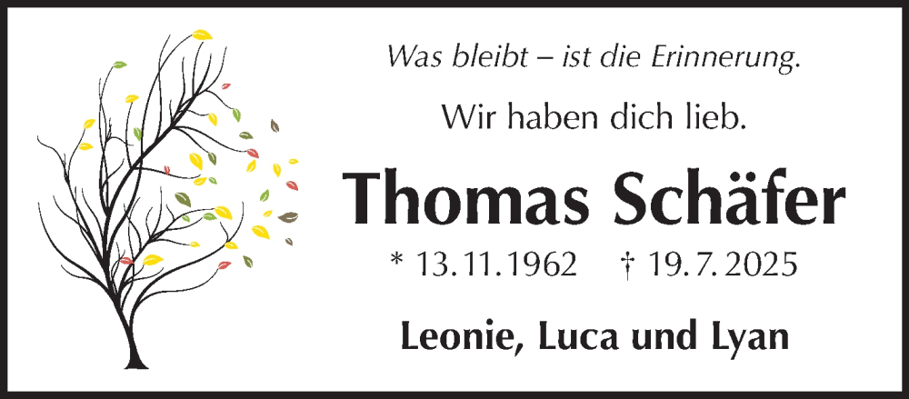 Hier finden Sie alle Traueranzeigen aus der Zeitung, die bisher für Thomas Schäfer erschienen sind. Weitere Traueranzeigen, die in der Zeitung erscheinen, werden hier ebenfalls aufgelistet