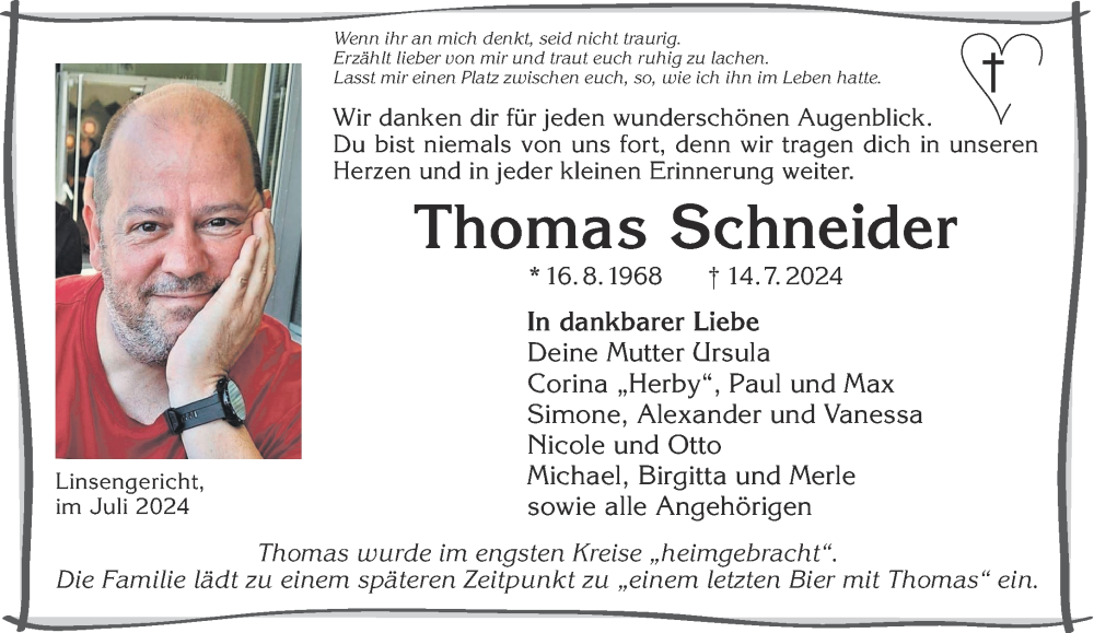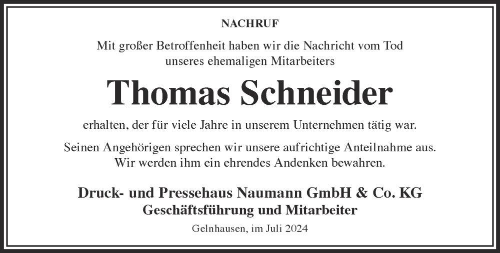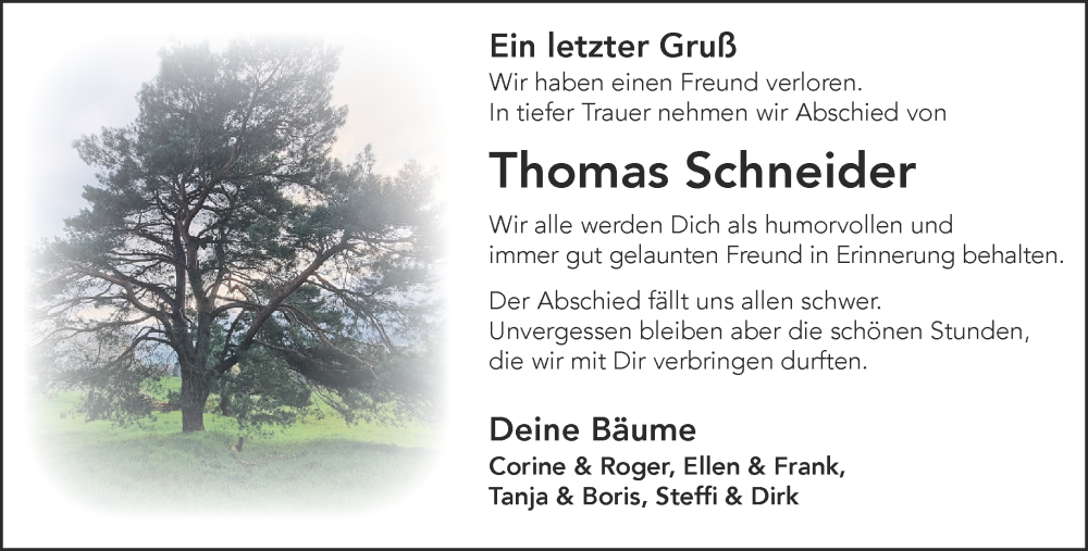 Hier finden Sie alle Traueranzeigen aus der Zeitung, die bisher für Thomas Schneider erschienen sind. Weitere Traueranzeigen, die in der Zeitung erscheinen, werden hier ebenfalls aufgelistet