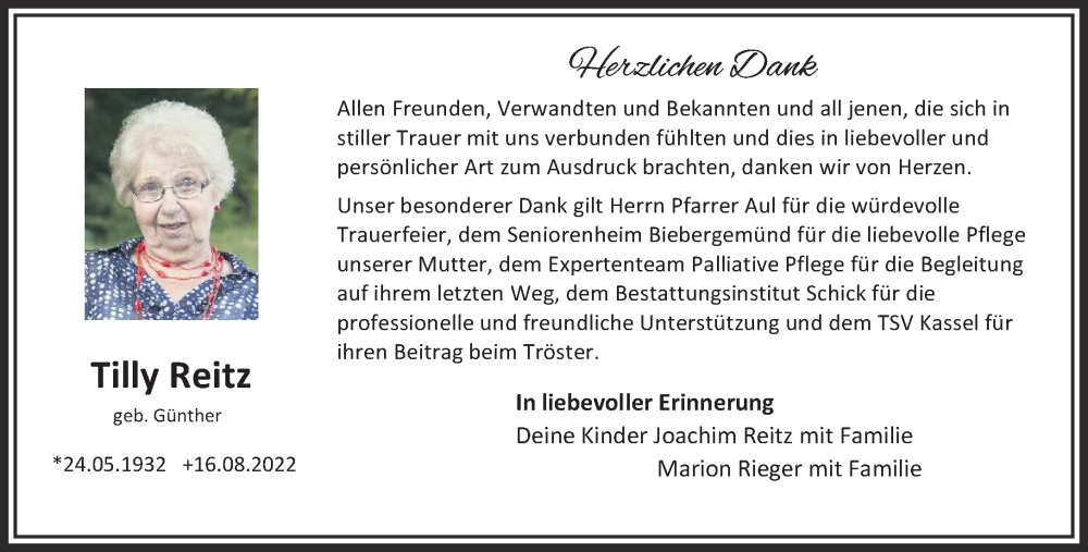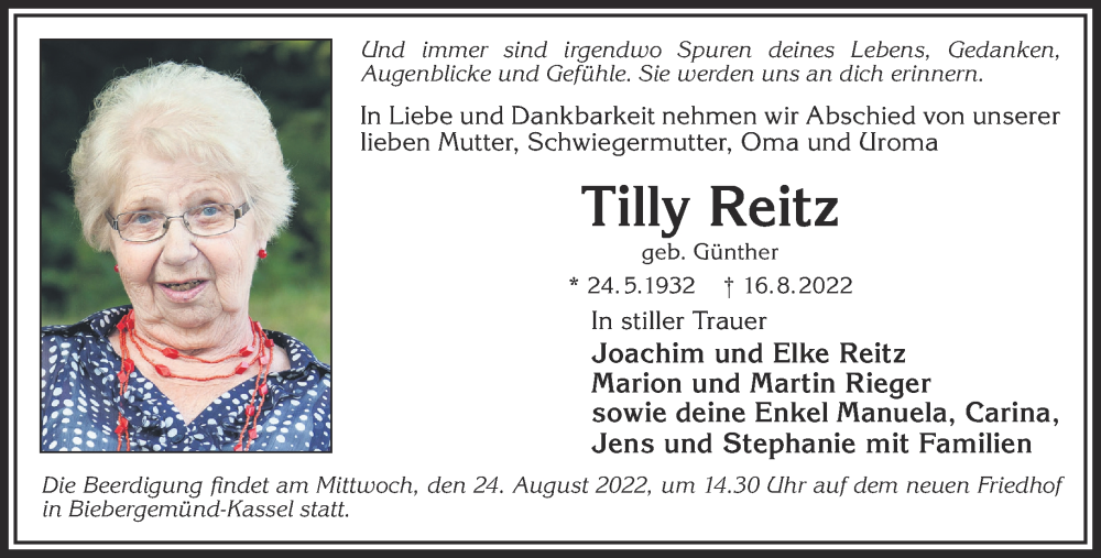 Hier finden Sie alle Traueranzeigen aus der Zeitung, die bisher für Tilly Reitz erschienen sind. Weitere Traueranzeigen, die in der Zeitung erscheinen, werden hier ebenfalls aufgelistet