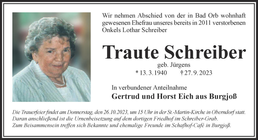Hier finden Sie alle Traueranzeigen aus der Zeitung, die bisher für Traute Schreiber erschienen sind. Weitere Traueranzeigen, die in der Zeitung erscheinen, werden hier ebenfalls aufgelistet