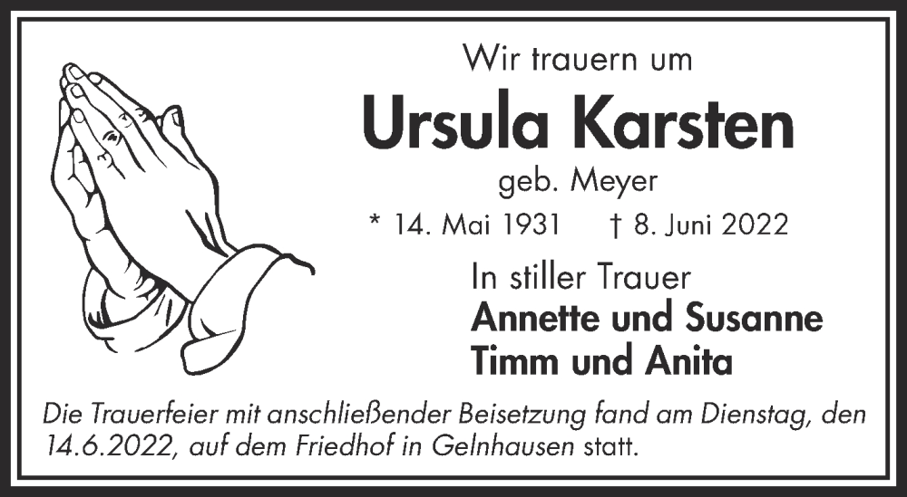 Hier finden Sie alle Traueranzeigen aus der Zeitung, die bisher für Ursula Karsten erschienen sind. Weitere Traueranzeigen, die in der Zeitung erscheinen, werden hier ebenfalls aufgelistet