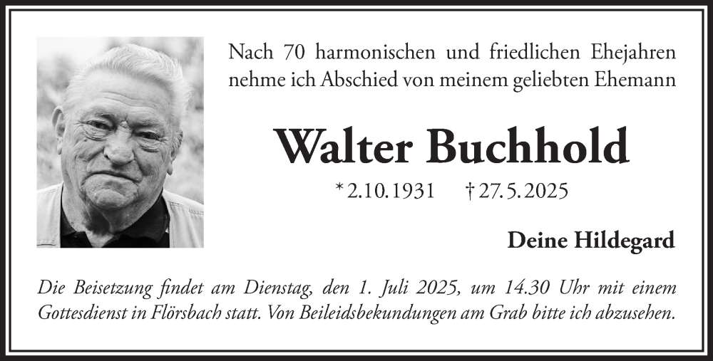 Hier finden Sie alle Traueranzeigen aus der Zeitung, die bisher für Walter Buchhold erschienen sind. Weitere Traueranzeigen, die in der Zeitung erscheinen, werden hier ebenfalls aufgelistet