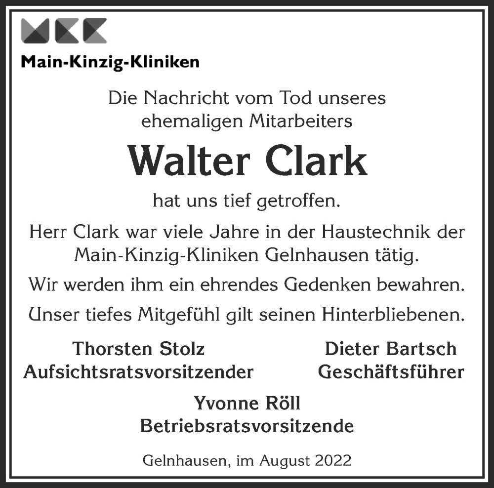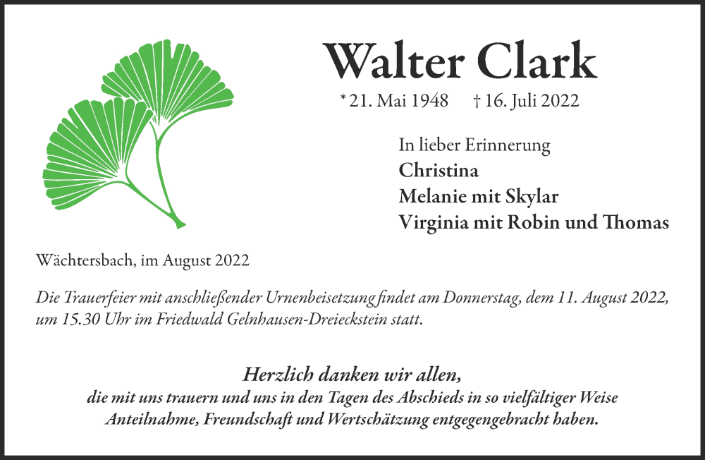 Hier finden Sie alle Traueranzeigen aus der Zeitung, die bisher für Walter Clark erschienen sind. Weitere Traueranzeigen, die in der Zeitung erscheinen, werden hier ebenfalls aufgelistet