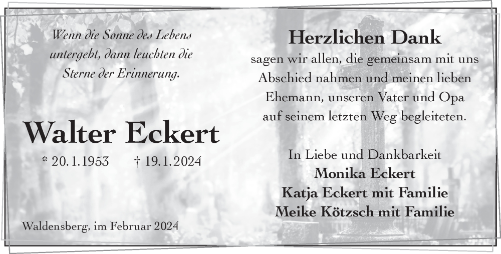 Hier finden Sie alle Traueranzeigen aus der Zeitung, die bisher für Walter Eckert erschienen sind. Weitere Traueranzeigen, die in der Zeitung erscheinen, werden hier ebenfalls aufgelistet