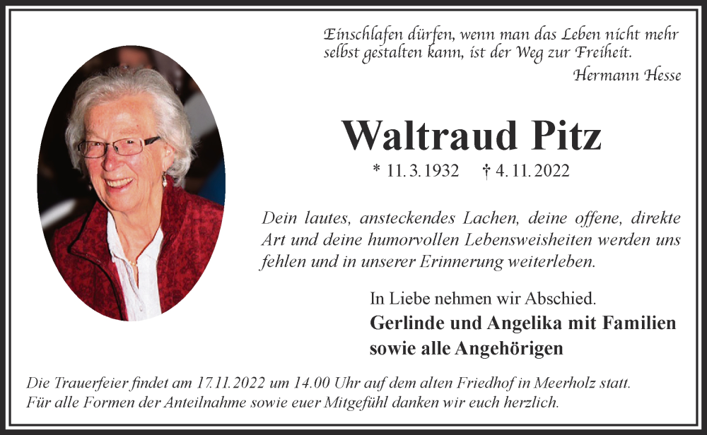 Hier finden Sie alle Traueranzeigen aus der Zeitung, die bisher für Waltraud Pitz erschienen sind. Weitere Traueranzeigen, die in der Zeitung erscheinen, werden hier ebenfalls aufgelistet