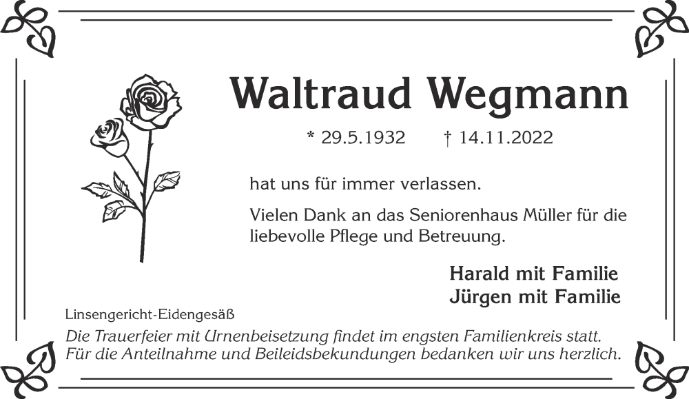 Hier finden Sie alle Traueranzeigen aus der Zeitung, die bisher für Waltraud Wegmann erschienen sind. Weitere Traueranzeigen, die in der Zeitung erscheinen, werden hier ebenfalls aufgelistet