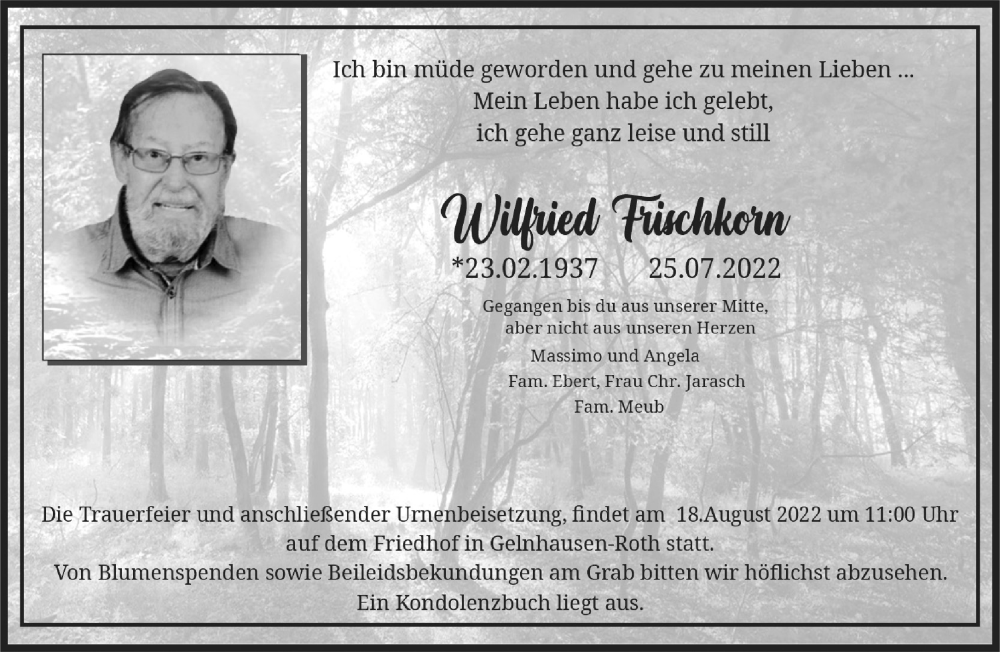 Hier finden Sie alle Traueranzeigen aus der Zeitung, die bisher für Wilfried Frischkorn erschienen sind. Weitere Traueranzeigen, die in der Zeitung erscheinen, werden hier ebenfalls aufgelistet