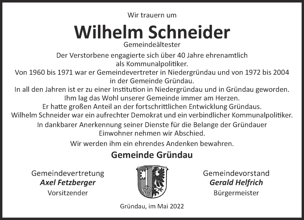 Hier finden Sie alle Traueranzeigen aus der Zeitung, die bisher für Wilhelm Schneider erschienen sind. Weitere Traueranzeigen, die in der Zeitung erscheinen, werden hier ebenfalls aufgelistet