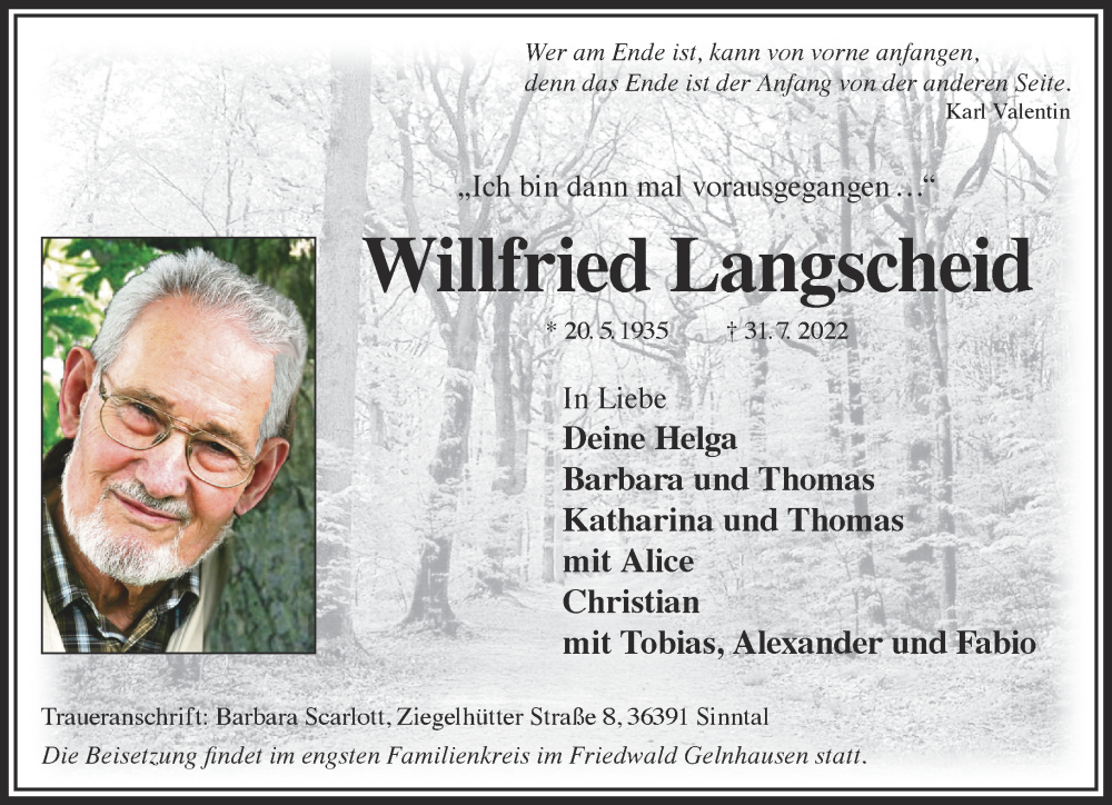 Hier finden Sie alle Traueranzeigen aus der Zeitung, die bisher für Willfried Langscheid erschienen sind. Weitere Traueranzeigen, die in der Zeitung erscheinen, werden hier ebenfalls aufgelistet