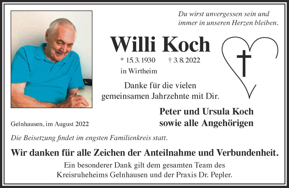 Hier finden Sie alle Traueranzeigen aus der Zeitung, die bisher für Willi Koch erschienen sind. Weitere Traueranzeigen, die in der Zeitung erscheinen, werden hier ebenfalls aufgelistet