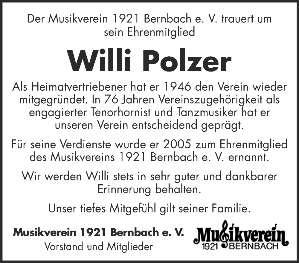 Hier finden Sie alle Traueranzeigen aus der Zeitung, die bisher für Willi Polzer erschienen sind. Weitere Traueranzeigen, die in der Zeitung erscheinen, werden hier ebenfalls aufgelistet