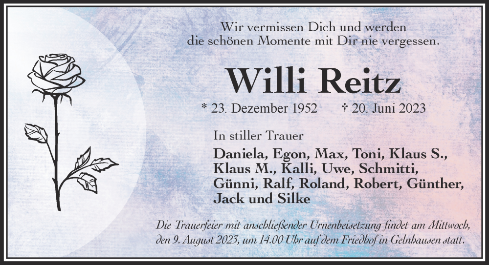 Hier finden Sie alle Traueranzeigen aus der Zeitung, die bisher für Willi Reitz erschienen sind. Weitere Traueranzeigen, die in der Zeitung erscheinen, werden hier ebenfalls aufgelistet