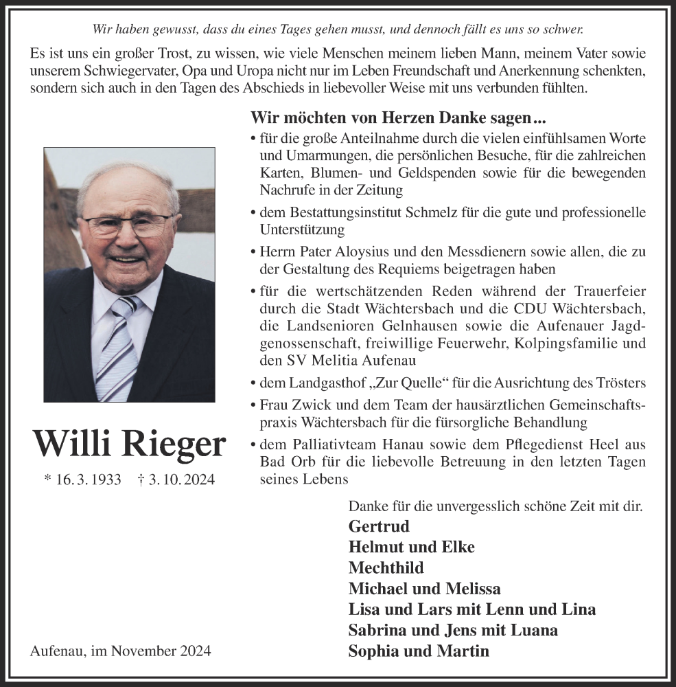 Hier finden Sie alle Traueranzeigen aus der Zeitung, die bisher für Willi Rieger erschienen sind. Weitere Traueranzeigen, die in der Zeitung erscheinen, werden hier ebenfalls aufgelistet
