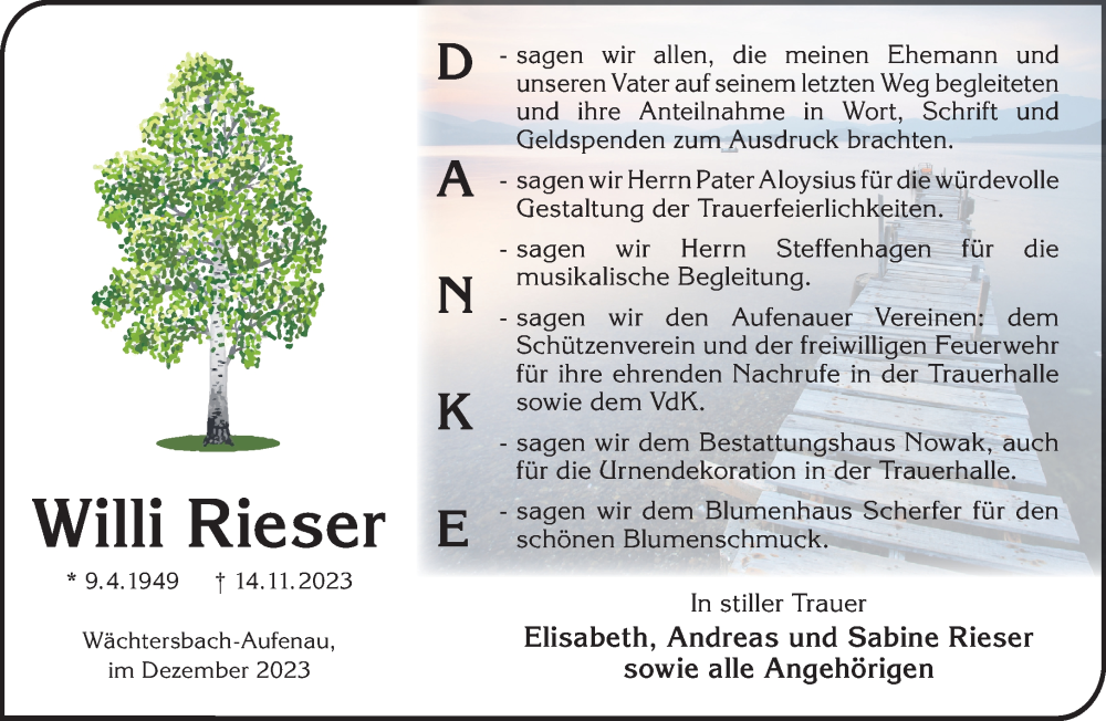 Hier finden Sie alle Traueranzeigen aus der Zeitung, die bisher für Willi Rieser erschienen sind. Weitere Traueranzeigen, die in der Zeitung erscheinen, werden hier ebenfalls aufgelistet
