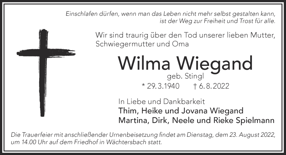 Hier finden Sie alle Traueranzeigen aus der Zeitung, die bisher für Wilma Wiegand erschienen sind. Weitere Traueranzeigen, die in der Zeitung erscheinen, werden hier ebenfalls aufgelistet
