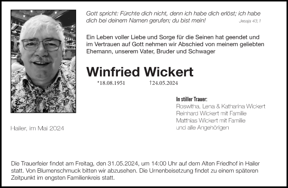 Hier finden Sie alle Traueranzeigen aus der Zeitung, die bisher für Winfried Wickert erschienen sind. Weitere Traueranzeigen, die in der Zeitung erscheinen, werden hier ebenfalls aufgelistet